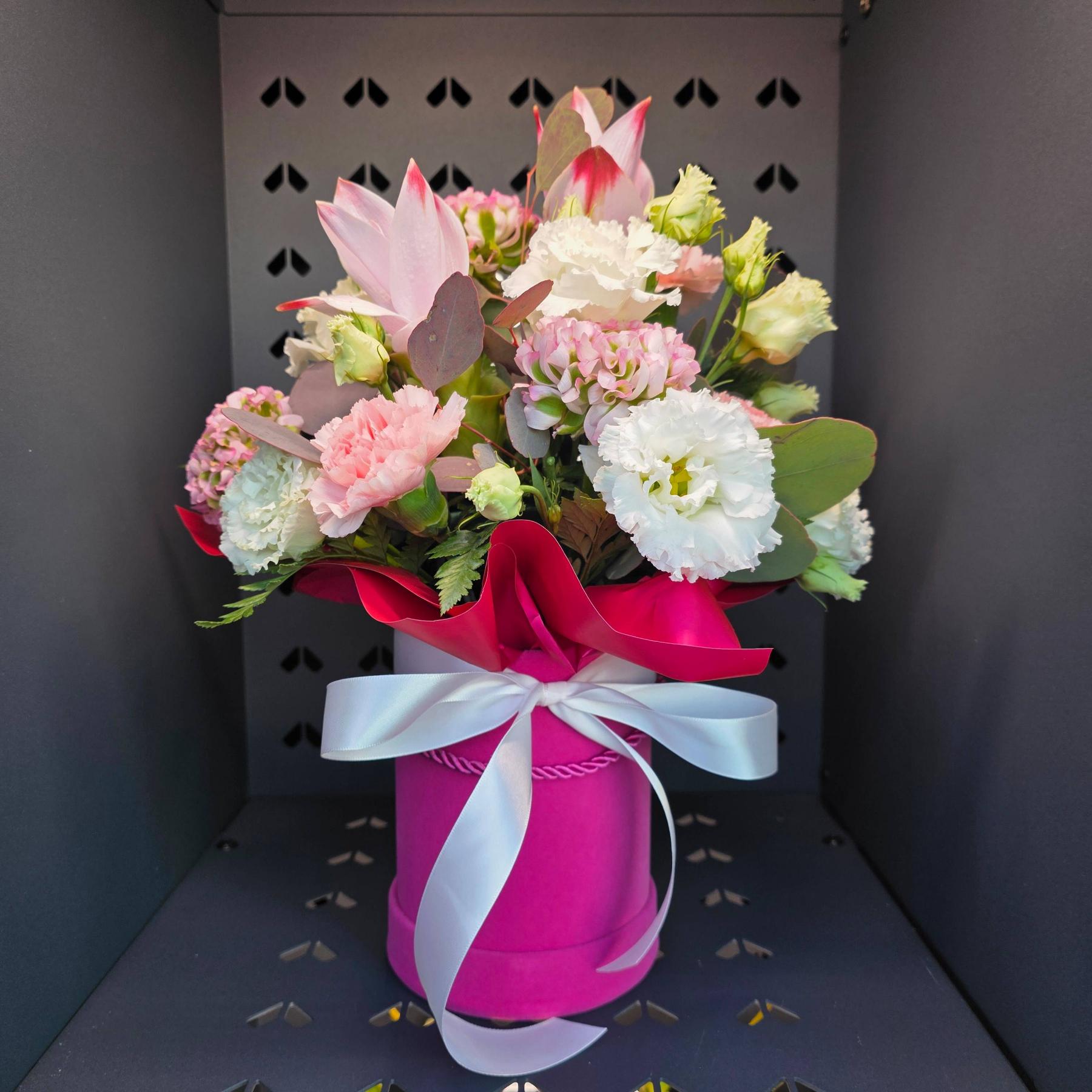Wyrazisty flowerbox w intensywnym różu, przełamany bielą i zielenią. Kompozycja o mocnym charakterze, ale zachowująca elegancki balans dzięki uporządkowanej formie w pudełku. Idealny wybór, gdy zależy na czymś bardziej zdecydowanym wizualnie. Flowerbox przygotowany przez lokalną kwiaciarnię VendiFlor w Bolesławcu, dostępny w Kwiatomacie.
