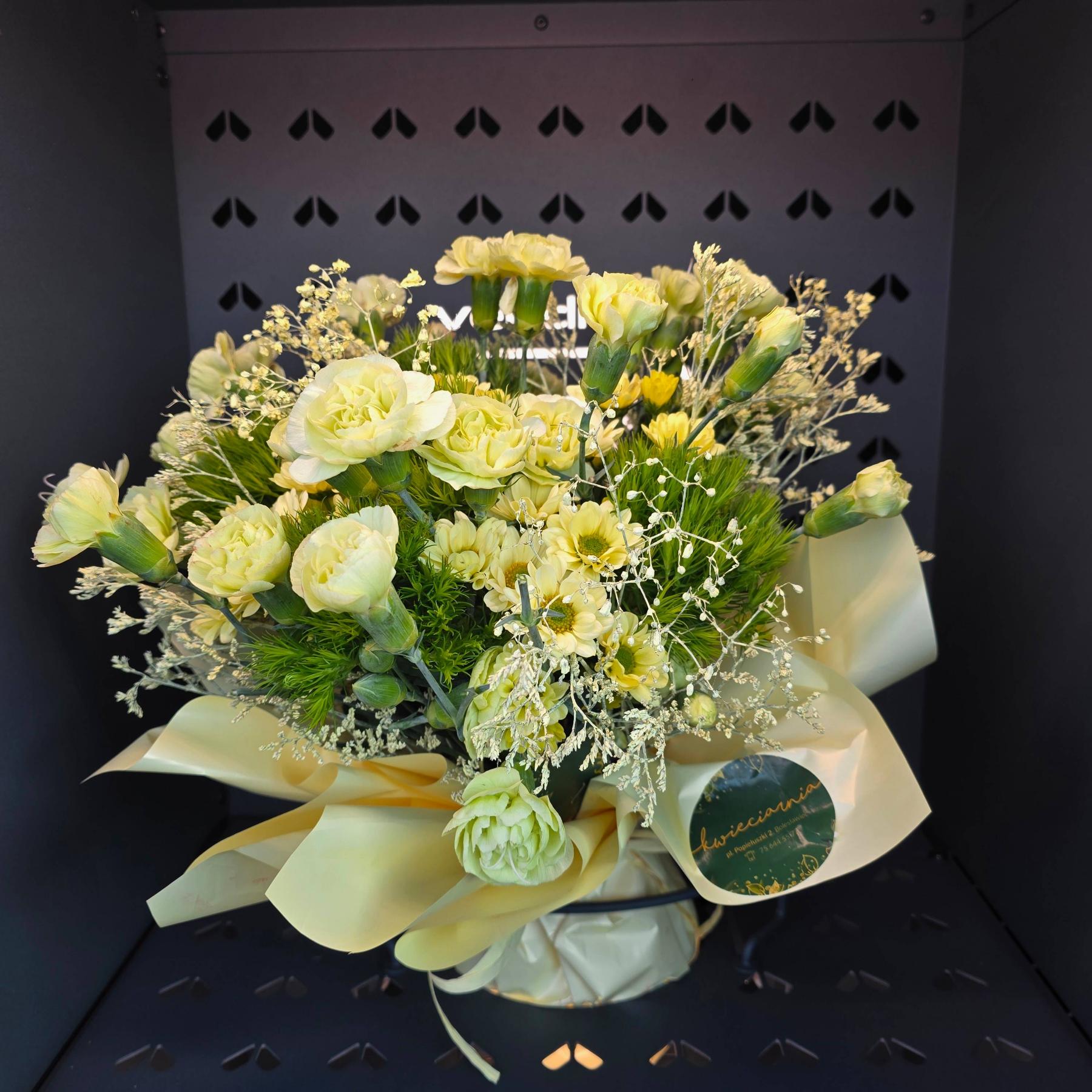 Lekka i świeża kompozycja w jasnych, cytrusowych tonach. Dominują delikatne żółcie i zielenie, które nadają całości nowoczesny i energetyczny charakter. Bukiet przyciąga naturalnością i świeżym wyglądem.