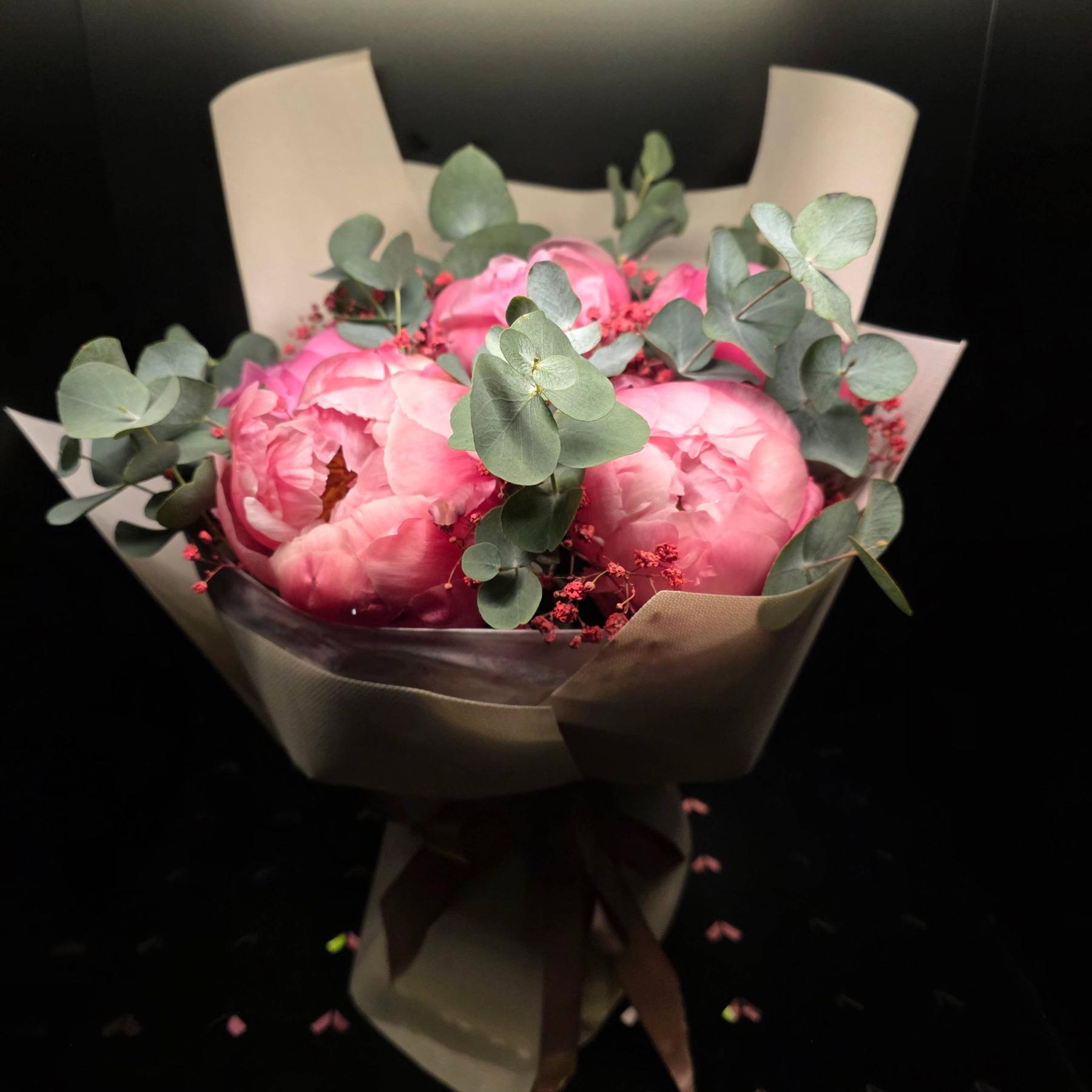 Romantyczny bukiet z dużych, pełnych piwonii w subtelnych różach, otulonych eukaliptusem. Lekki, świeży i bardzo kobiecy – idealny na prezent bez okazji, który wywoła uśmiech i zachwyt. Naturalna elegancja w nowoczesnym wydaniu.