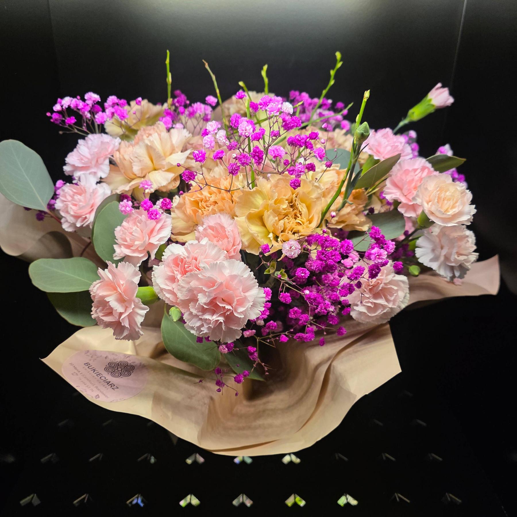 Bukiet pełen drobnych, pastelowych kwiatów – goździków, dodatków strukturalnych i zieleni. Tworzy wrażenie lekkiego, naturalnego ogrodu zamkniętego w kompozycji. Radosny, kobiecy i bardzo uniwersalny.