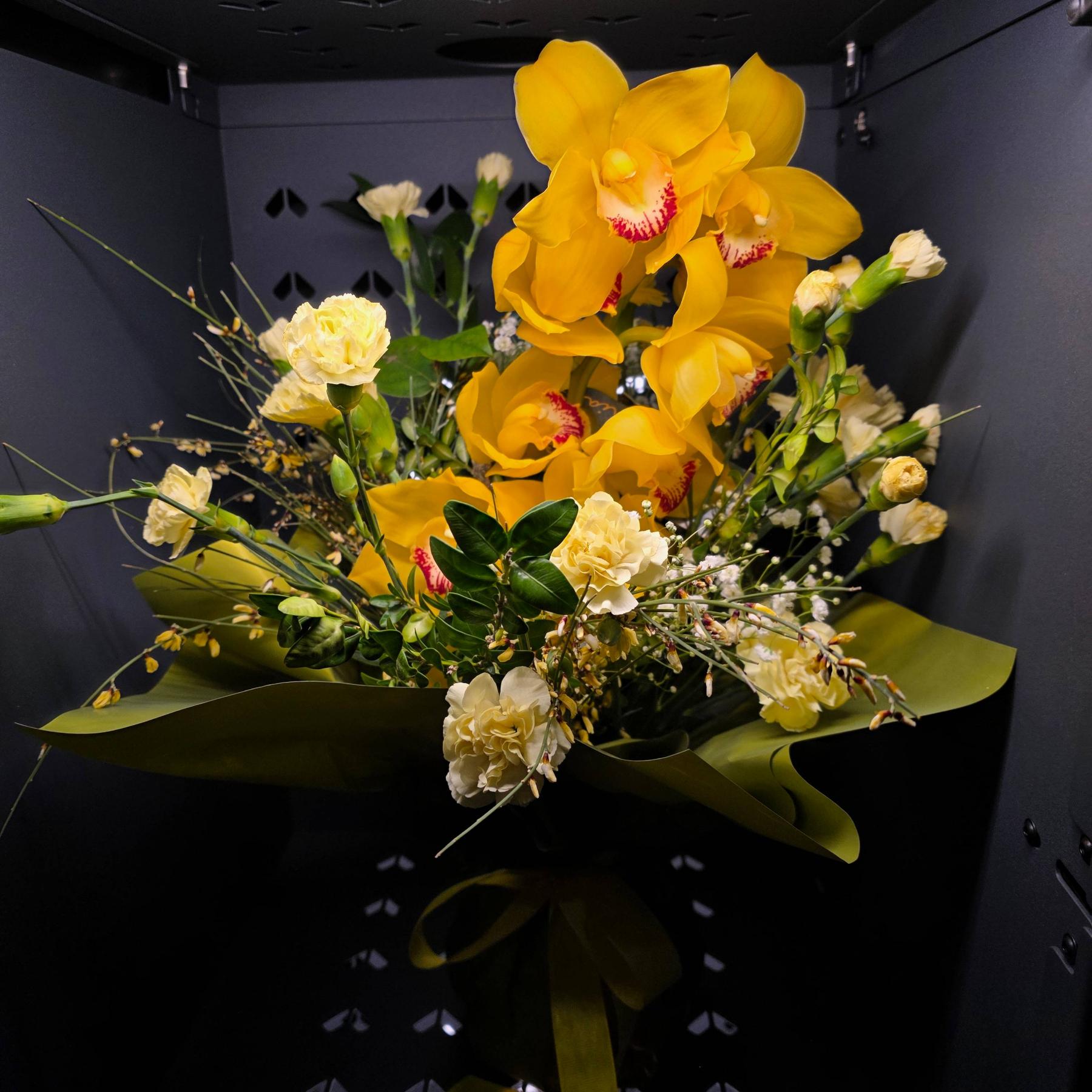 Ciepły bukiet w odcieniach żółci, z dominującymi storczykami i jasnymi dodatkami. Całość jest harmonijna, pełna światła i bardzo przyjemna w odbiorze.