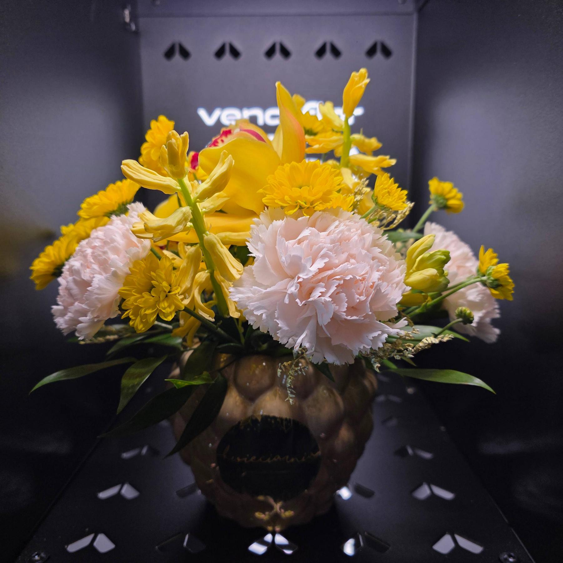 Ciepła, pełna światła kompozycja w ceramicznym naczyniu w odcieniach żółci i delikatnego różu. Połączenie goździków, drobnych kwiatów sezonowych i wyrazistego akcentu orchidei tworzy radosny, ale jednocześnie elegancki efekt.