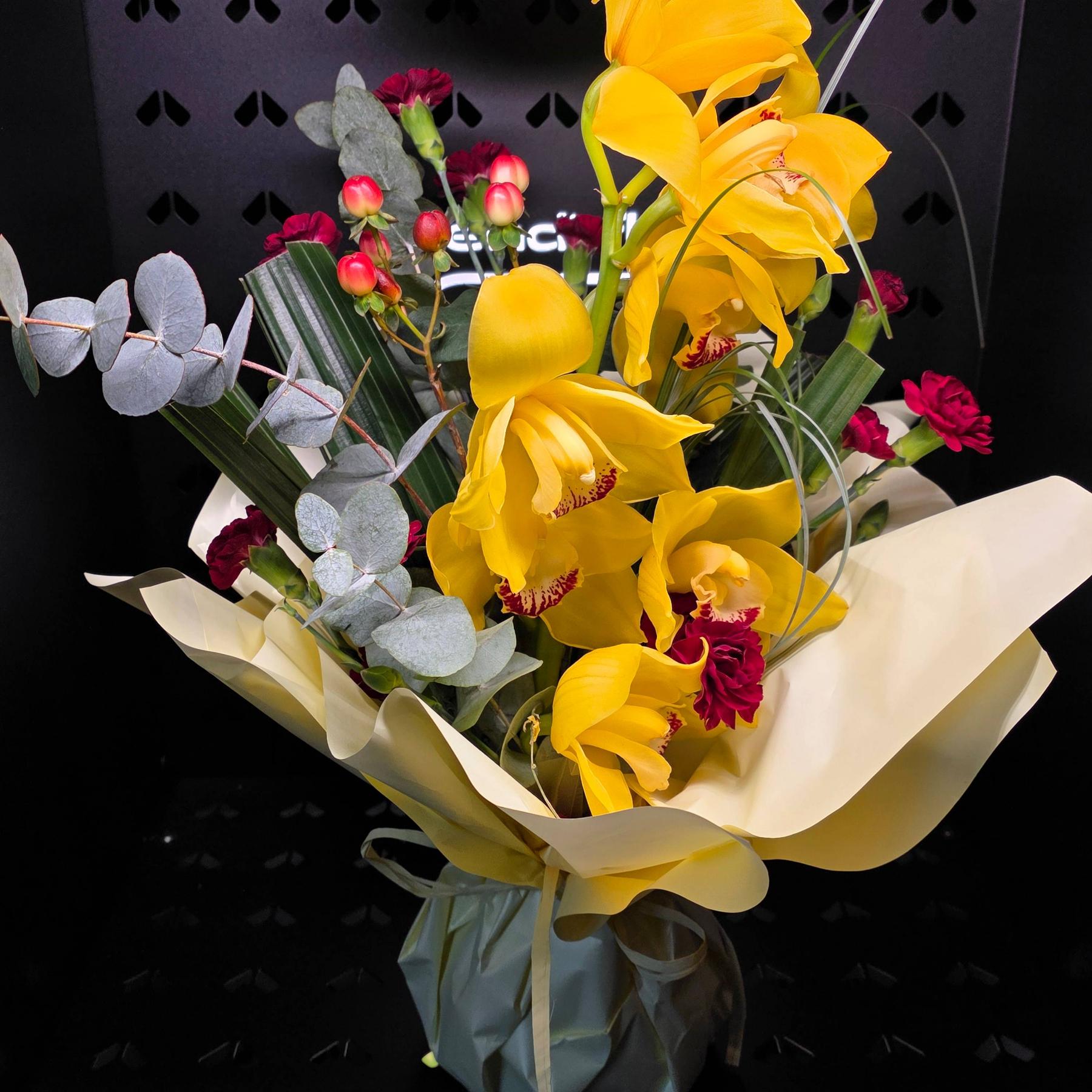 Elegancki bukiet z dominującym żółtym storczykiem, uzupełniony głęboką czerwienią i chłodną zielenią. Kontrast kolorów podkreśla jego wyrafinowany i nowoczesny charakter.