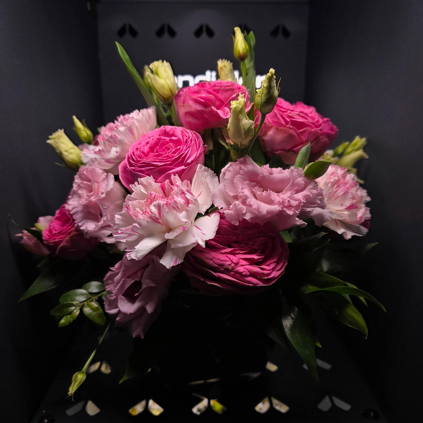 Delikatna kompozycja w naczyniu ceramicznym w odcieniach różu, łączący pełne róże z lekkimi goździkami i subtelną zielenią. Kompozycja miękka, romantyczna i bardzo kobieca w odbiorze.