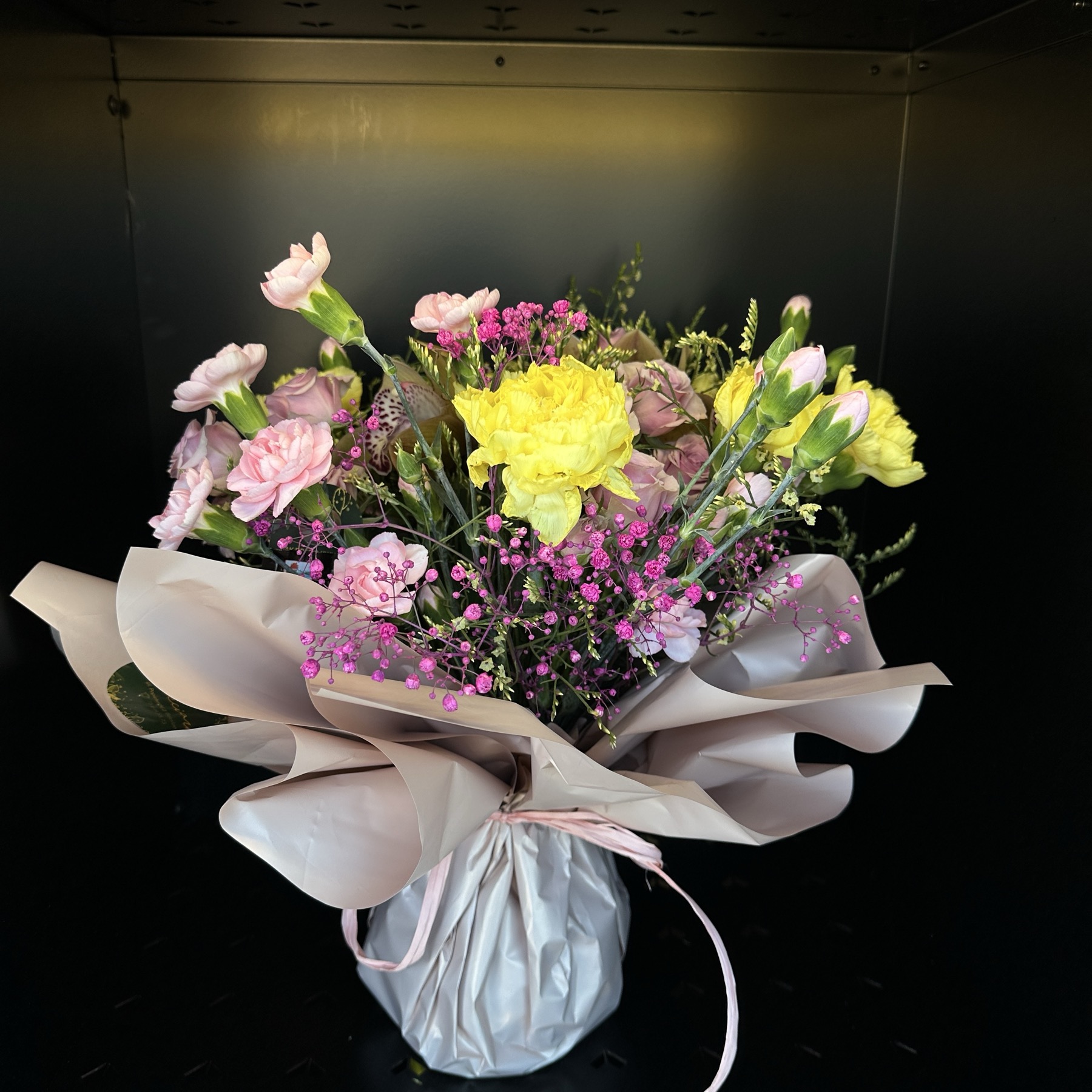 Delikatna kompozycja w pastelowych odcieniach różu z jasnym, słonecznym akcentem żółtych goździków. Uzupełniona lekką gipsówką i świeżą zielenią, tworzy subtelny, radosny bukiet.