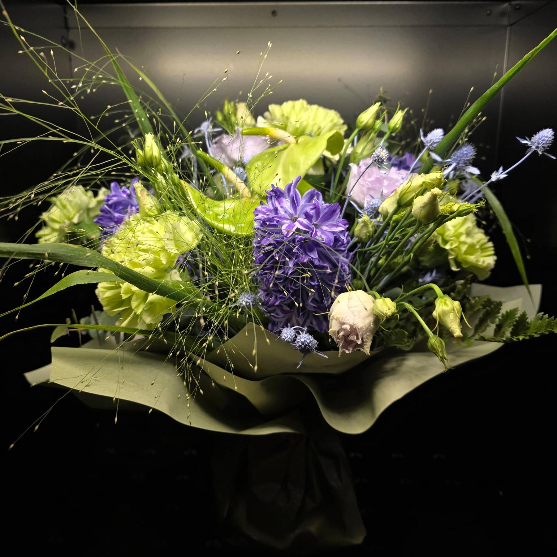 Nowoczesna kompozycja inspirowana naturą – zielenie, fiolety i subtelne błękity tworzą świeży, lekki i nieoczywisty bukiet. Doskonały wybór dla osób lubiących naturalne klimaty i mniej klasyczne zestawienia kolorystyczne.