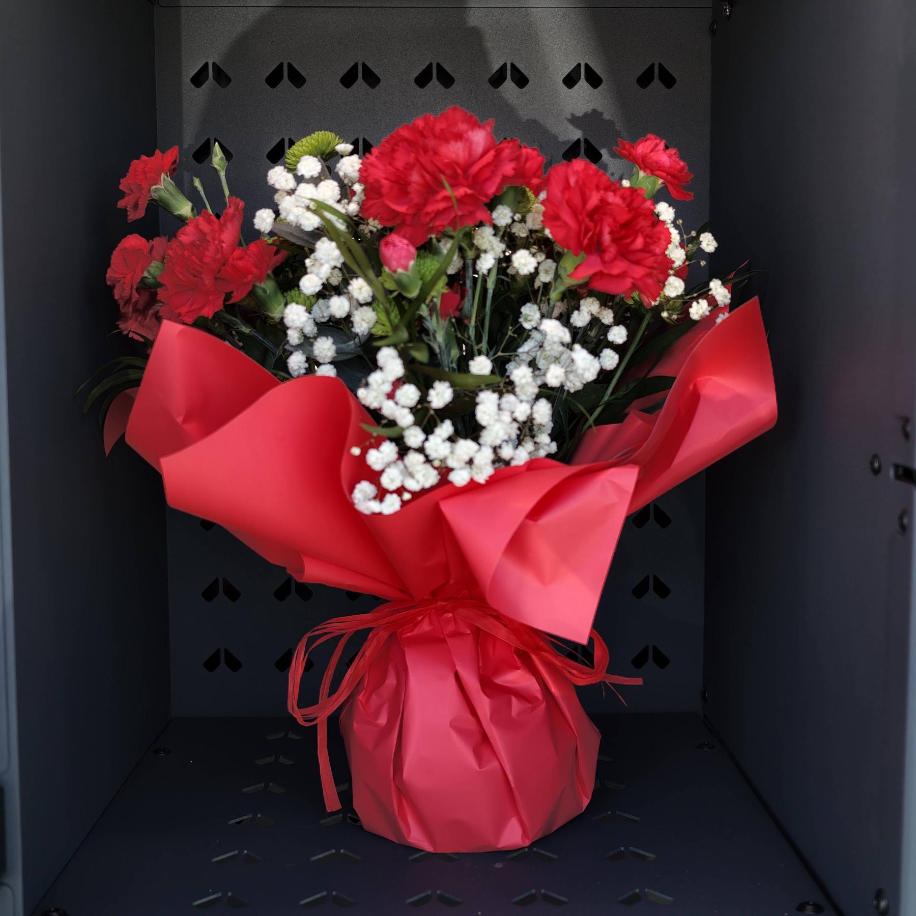 Klasyczny bukiet z czerwonych goździków otulonych delikatną gipsówką i świeżą zielenią. Intensywna czerwień kwiatów i eleganckie czerwone opakowanie tworzą wyrazistą kompozycję, idealną aby podkreślić ważne uczucia i wyjątkowe chwile.