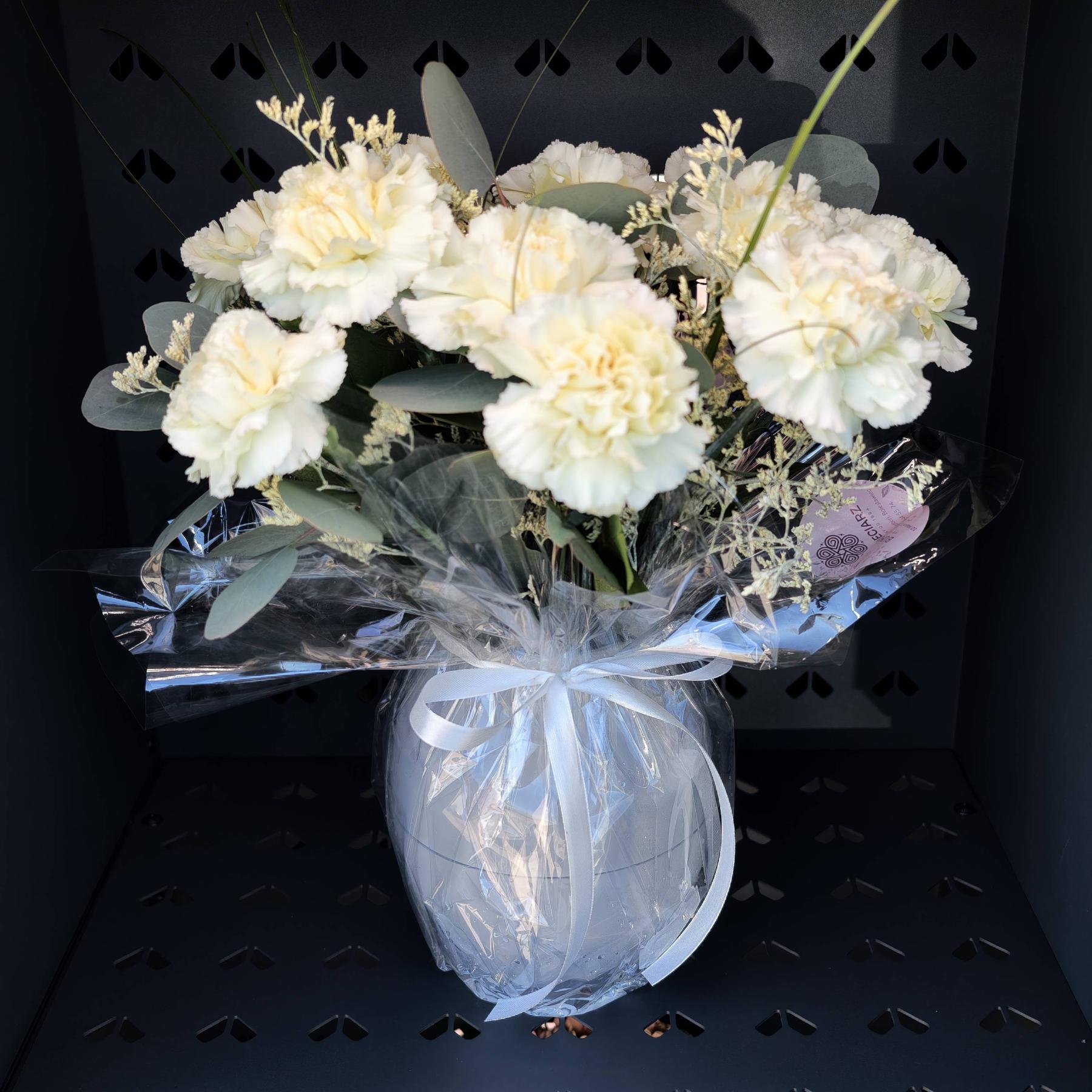 Elegancka kompozycja z kremowych goździków z dodatkiem delikatnych traw, eukaliptusa i subtelnych wypełniaczy. Bukiet umieszczony w ozdobnym białym naczyniu tworzy lekką i bardzo elegancką całość. Idealny prezent dla kobiety, który wprowadza do wnętrza spokój i naturalne piękno.